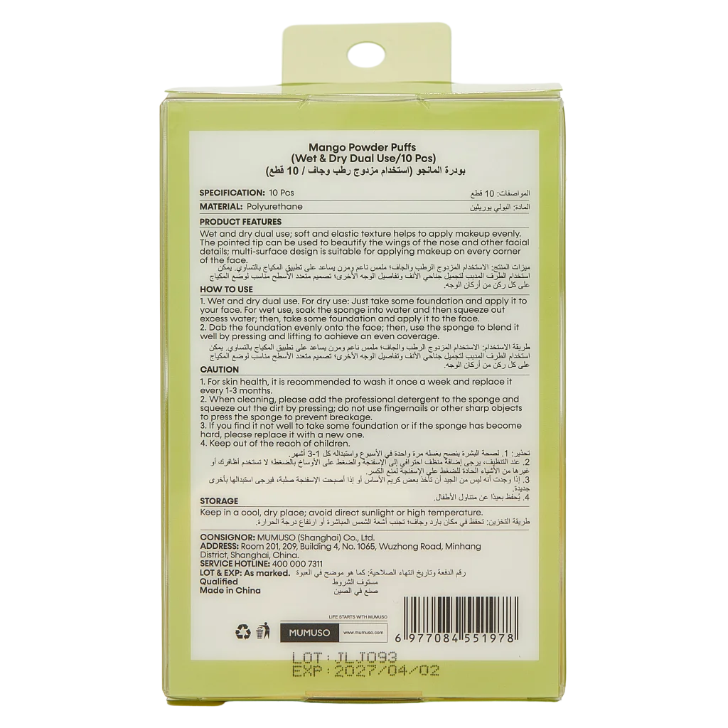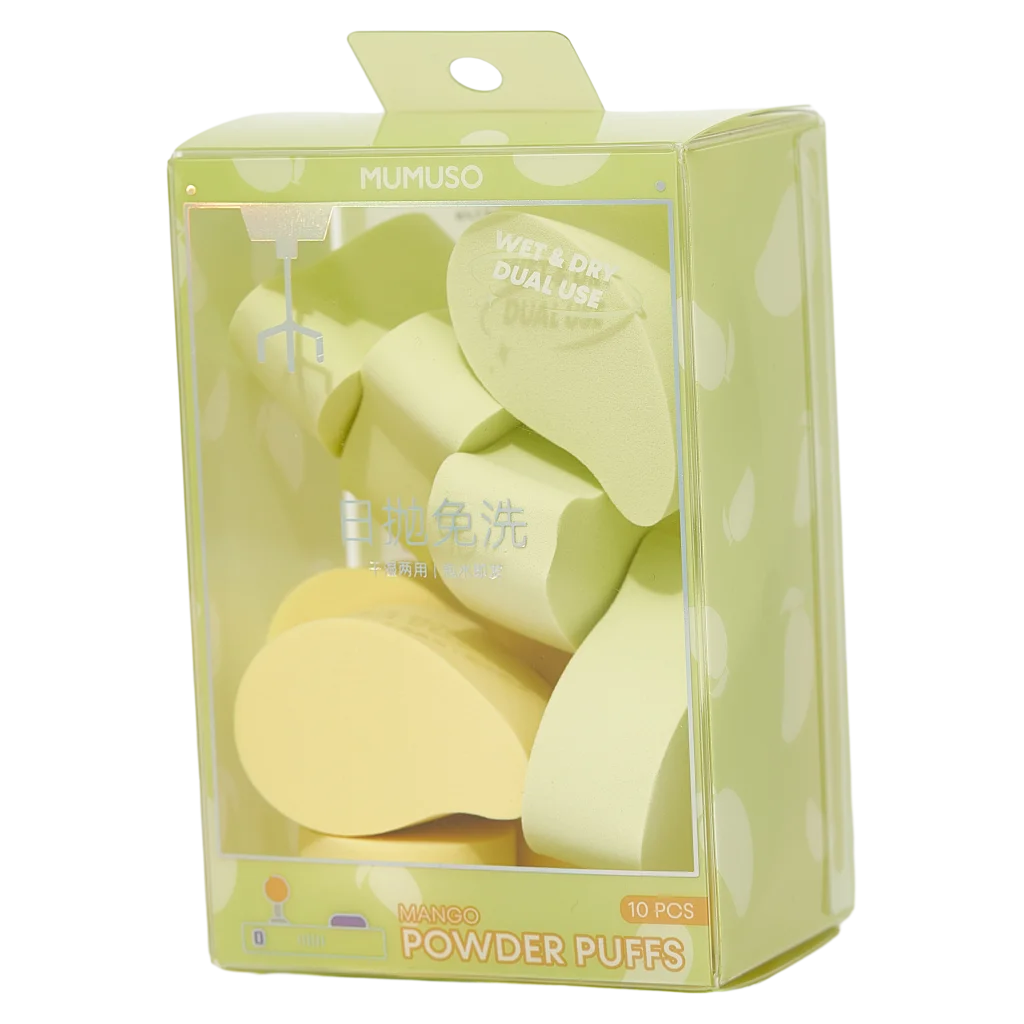 Gefertigt aus hochwertigem Polyurethan und inspiriert vom hellgelben Farbton der Mango, liegen die Schwämmchen angenehm in der Hand. Die Packung enthält zehn formstabile Schwämmchen mit sanft abgerundeten Kanten für präzises Arbeiten.