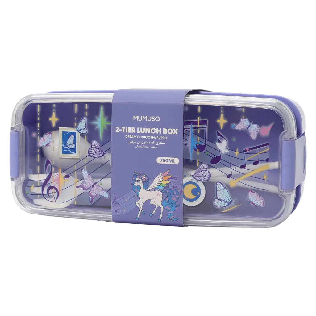 Diese 2-stöckige Lunchbox mit Einhorn-Design (Lila) ermöglicht das getrennte Aufbewahren von unterschiedlichen Speisen und ist ideal für Schule, Büro und Freizeit geeignet. Dank des Volumens von 750 ml bietet sie ausreichend Platz für abwechslungsreiche Mahlzeiten.