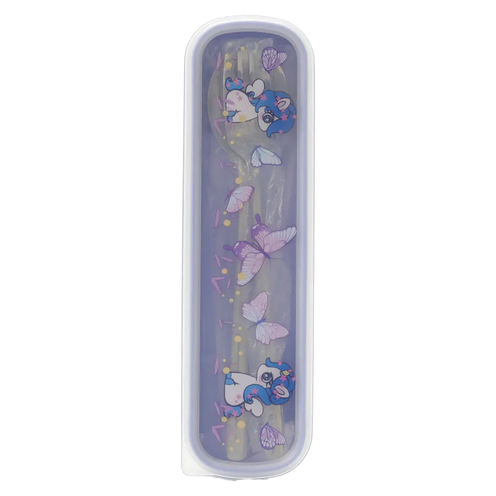 Die Besteckteile sind aus hochwertigem Edelstahl gefertigt und im farbenfrohen Einhorn-Design gestaltet. Die Aufbewahrungsbox in Lila schützt das Besteck und hält es hygienisch sauber – eine kindgerechte Lösung für unterwegs.