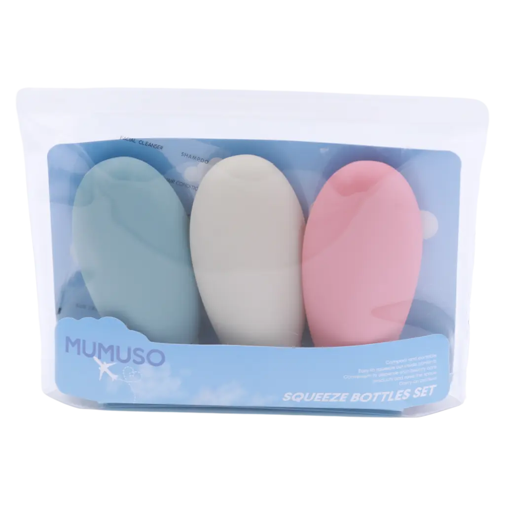 Das 3-teilige Squeeze-Flaschen-Set in Pastelltönen (Blau/Rosa/Beige) ist ideal zur Dosierung von Shampoo, Duschgel oder Gesichtsreiniger auf Reisen oder im Alltag. Die flexiblen Reiseflaschen erleichtern das Abfüllen und gezielte Entnehmen von Flüssigprodukten. Zwei kurze Keywords: Squeeze-Flasche, Reiseflasche.