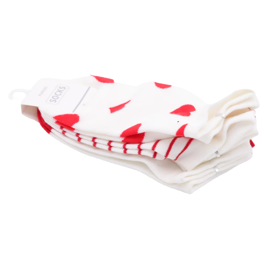 Gefertigt aus 56,2% Baumwolle, 41,7% Polyesterfaser und 2,1% Elasthan bieten die Socken ein weiches Gefühl und eine optimale Passform. Die Kombination aus Herz-Design und Streifen-Print in Weiß und Rot verleiht jedem Outfit einen verspielten Akzent.