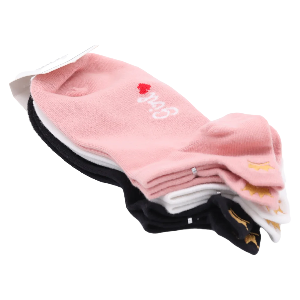 Gefertigt aus einer hochwertigen Mischung aus 66 % Baumwolle, 31,7 % Polyesterfaser und 2,3 % Elasthan, überzeugen die Socken durch weichen Sitz und elastische Dehnbarkeit. Im Set enthalten sind drei Farben (Schwarz/Weiß/Rosa), veredelt durch kleine Details wie Herz- und Kronen-Designs für das gewisse Etwas.