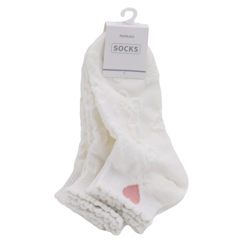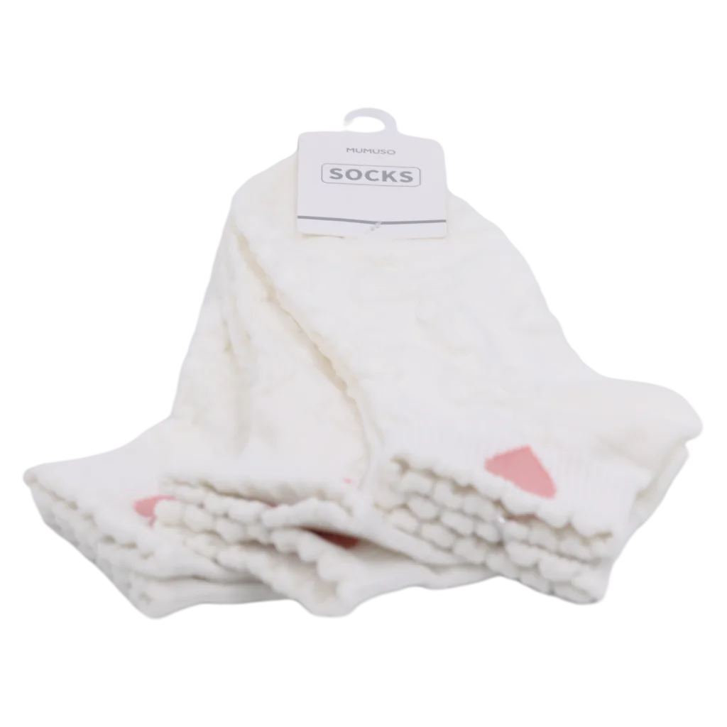 Die Socken bestehen aus einem weichen Baumwollmix mit 65% Baumwolle, 33% Polyester und 2% Elasthan. Durch das dezente Weiß und das eingestrickte pinke Herz-Design werden sie schnell zum Lieblingsstück in der Garderobe.