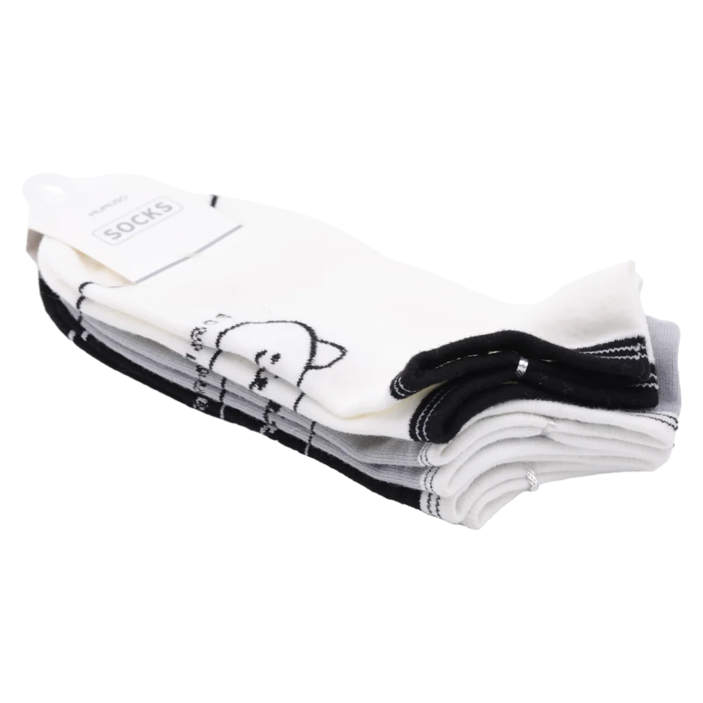 Gefertigt aus einer weichen Baumwollmischung mit 65% Baumwolle, 33% Polyester und 2% Elasthan, überzeugen die Socken durch ein liebevolles Bär-Design auf jedem Paar. Das Set enthält die drei klassischen Farben (Weiß/Grau/Schwarz), die leicht zu verschiedenen Outfits passen.