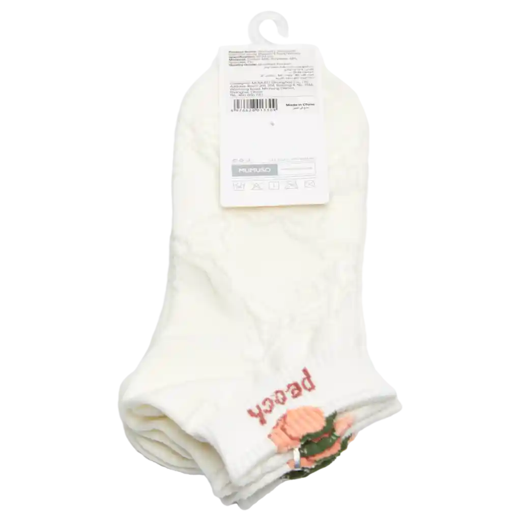 Das 3er-Pack Damen Sneakersocken aus Baumwollmischung bietet hohen Tragekomfort und ist ideal für Alltag und Freizeit. Das dezente Pfirsich-Design auf weißem Grund sorgt für einen frischen Akzent. Die atmungsaktiven Socken sind angenehm weich und für verschiedene Schuharten geeignet.