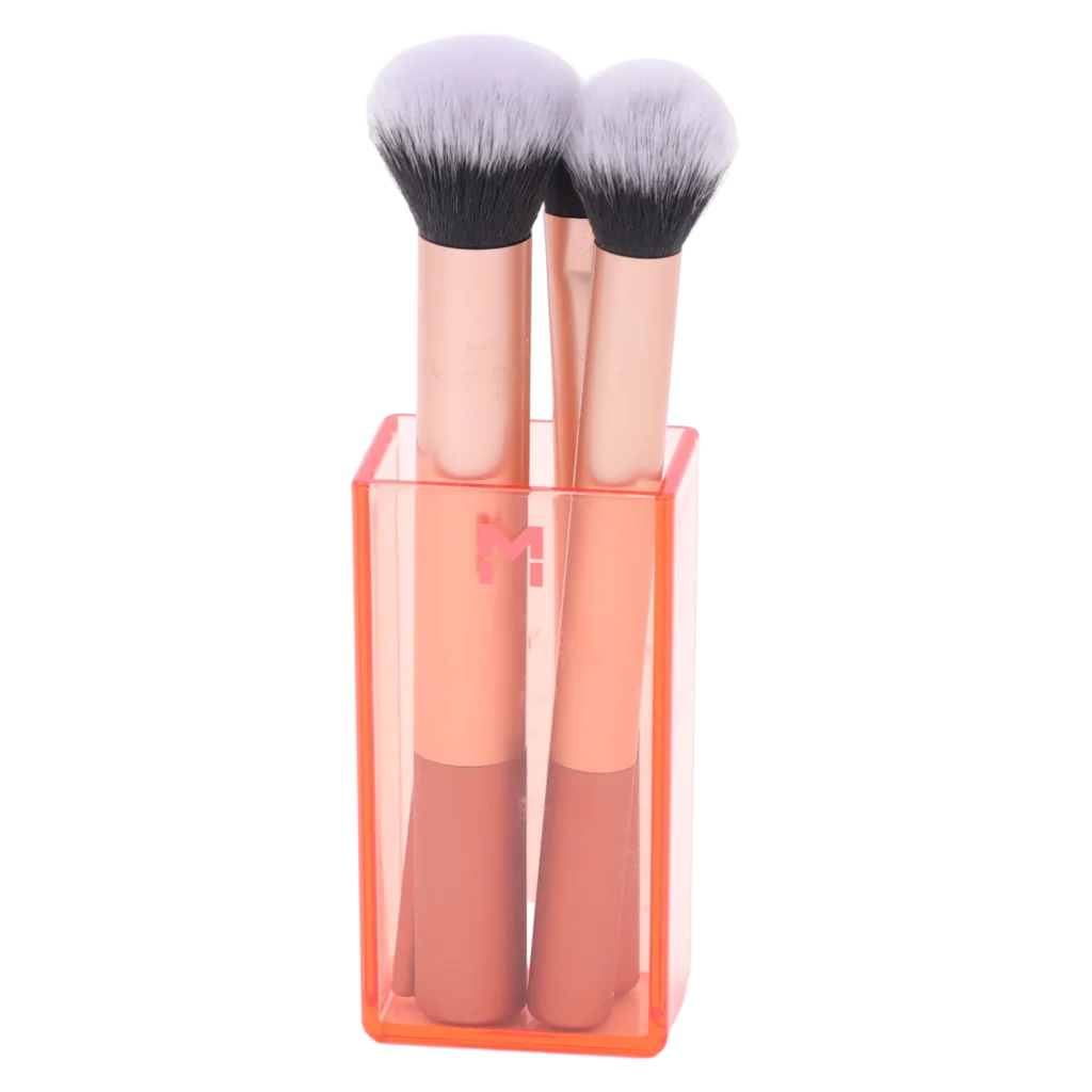 Die Pinsel überzeugen durch ein modernes zweifarbiges Design in Rosa/Gold und sind ergonomisch geformt. Hochwertige, extra weiche Synthetikfasern ermöglichen ein sanftes Auftragen von pudrigen und cremigen Produkten. Der beiliegende Pinselhalter sorgt für Ordnung auf dem Schminktisch.
