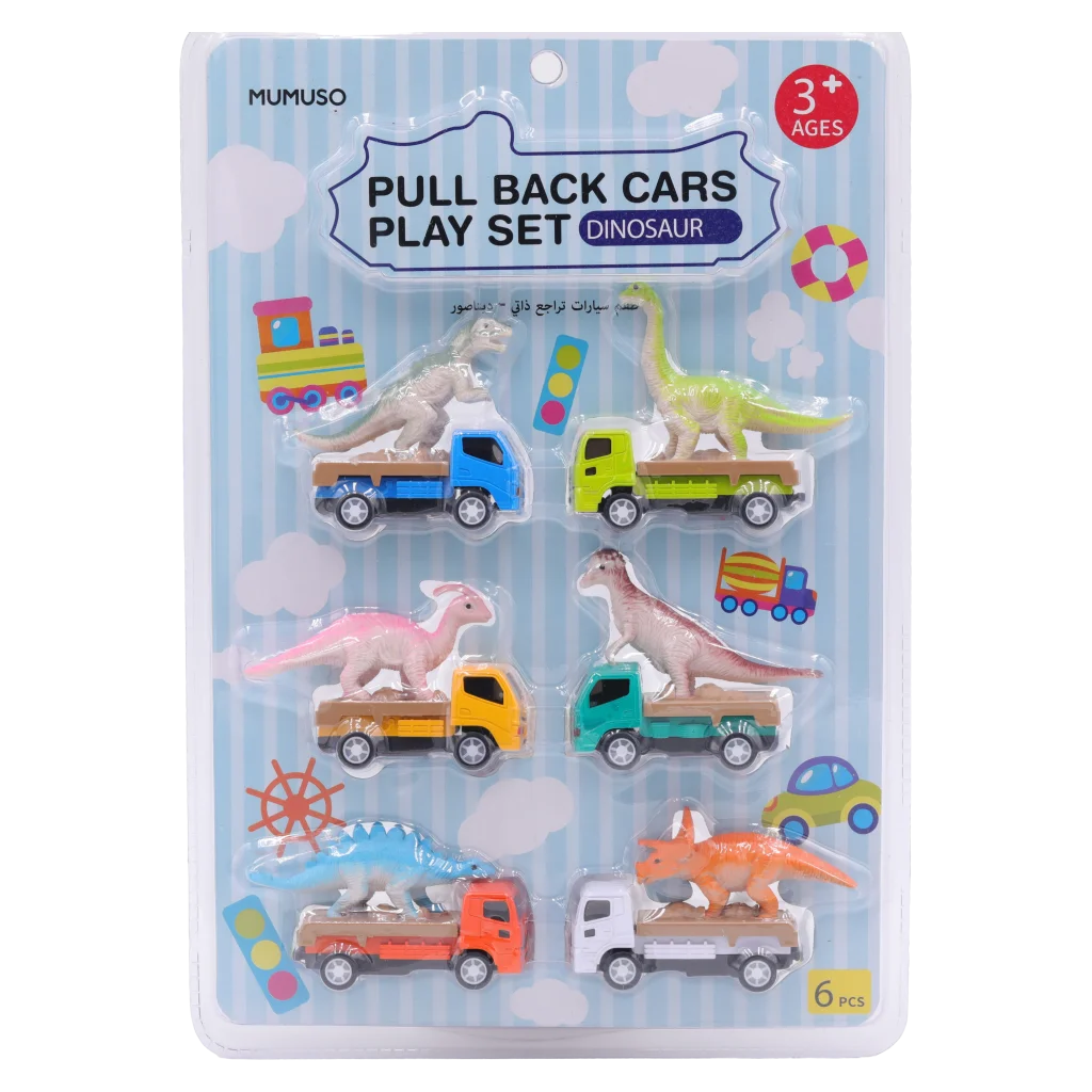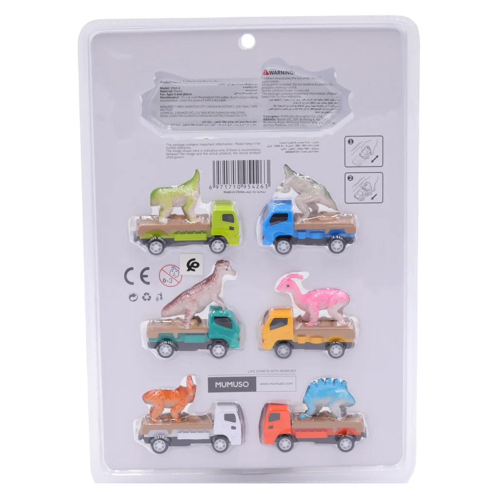 6-teiliges Rückziehauto-Set aus Kunststoff mit Dinosaurier-Design (Grün/Gelb/Blau/Orange/Pink/Weiß)