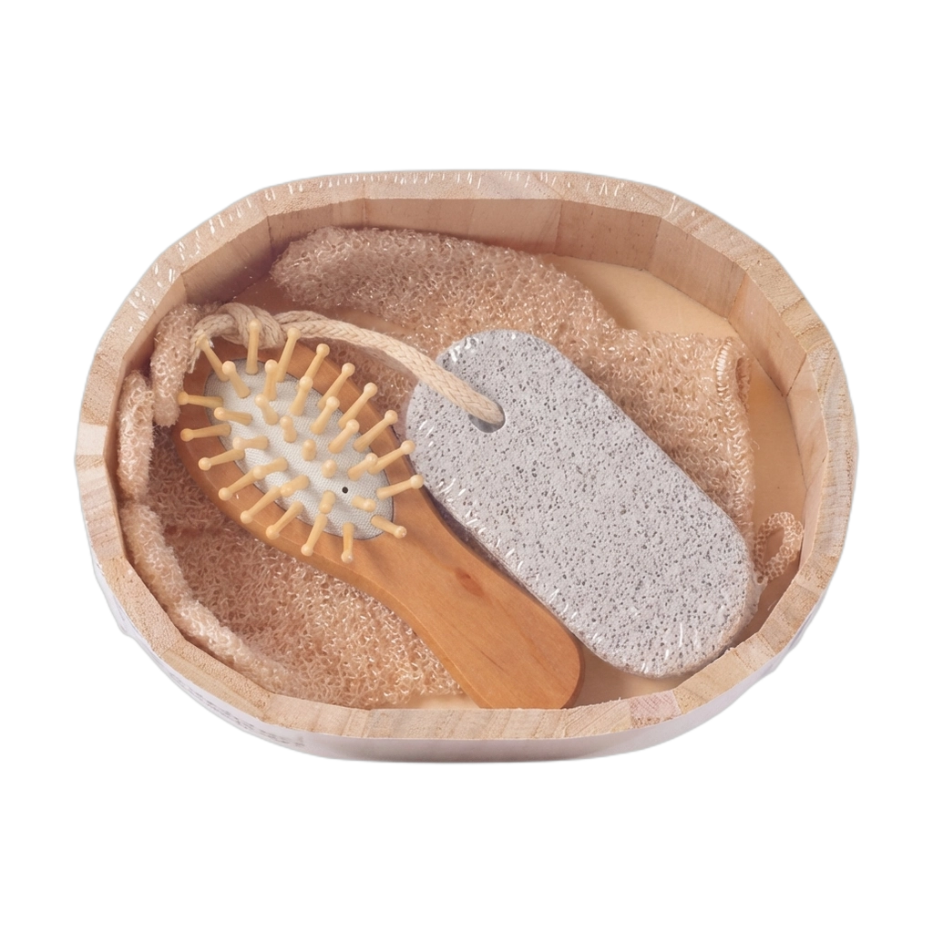 Dieses Badezubehör-Set bietet eine Holz-Haarbürste und einen Bimsstein, die perfekt für die Körperpflege geeignet sind. Ideal für alle, die Wert auf natürliche Materialien legen.