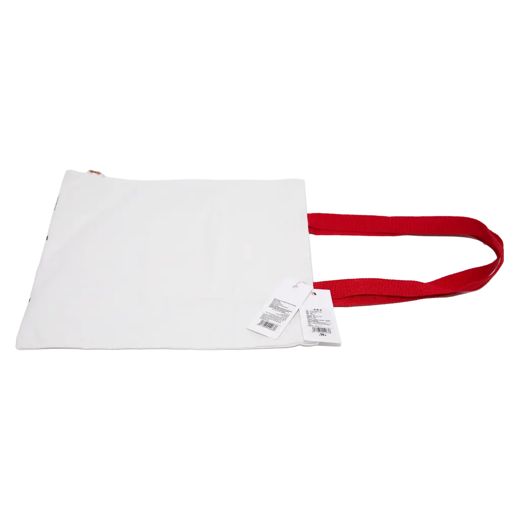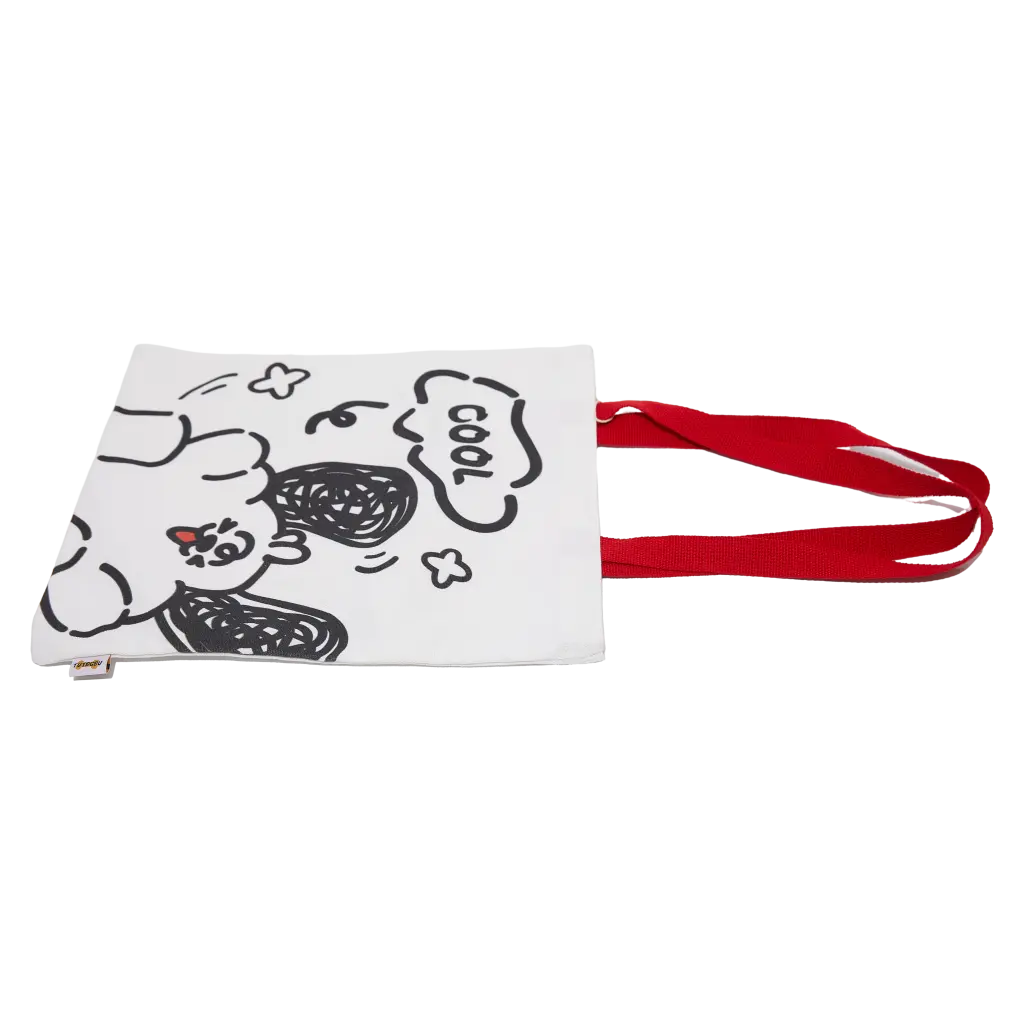 Die Tasche überzeugt mit einem auffälligen Print auf weißem Stoff und verfügt über stabile rote Tragehenkel. Das moderne, grafische Design sorgt für einen individuellen Look und macht die Stofftasche zum Hingucker.