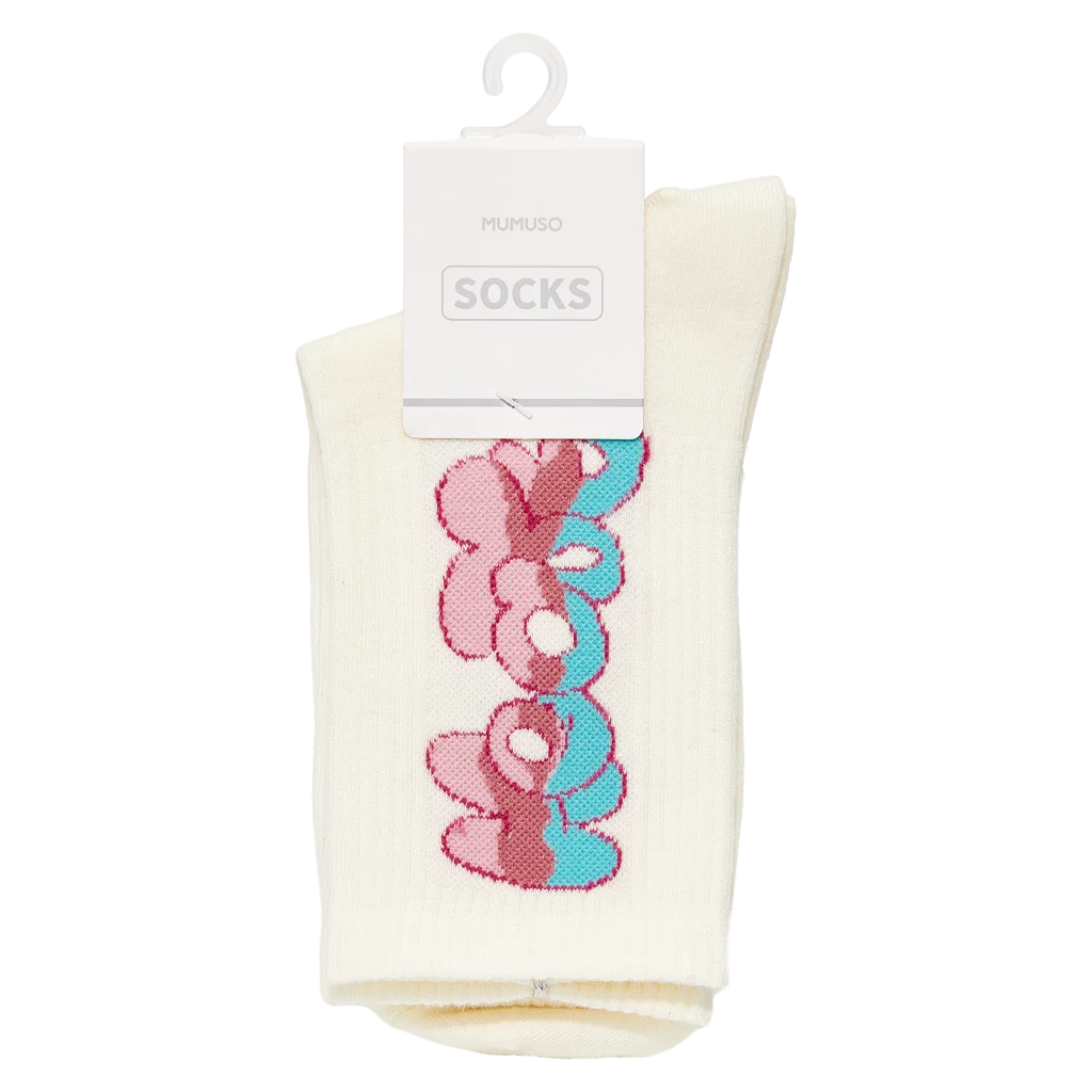Die Socken überzeugen mit einem auffälligen 3D-Lettering-Design in leuchtenden Farben auf hellem Grund. Gefertigt aus 67% Baumwolle, 30% Polyamid und 3% Elasthan, bieten sie eine gelungene Balance aus Weichheit, Dehnbarkeit und Langlebigkeit.