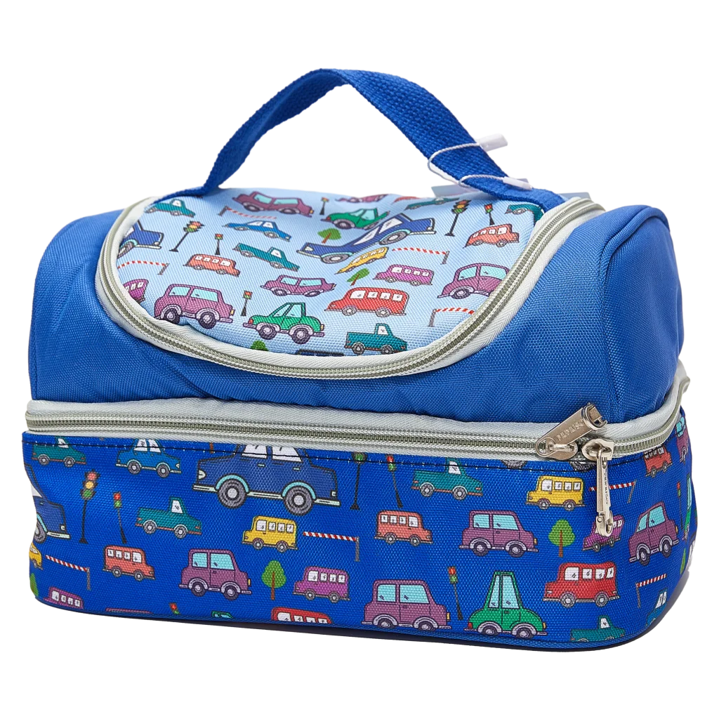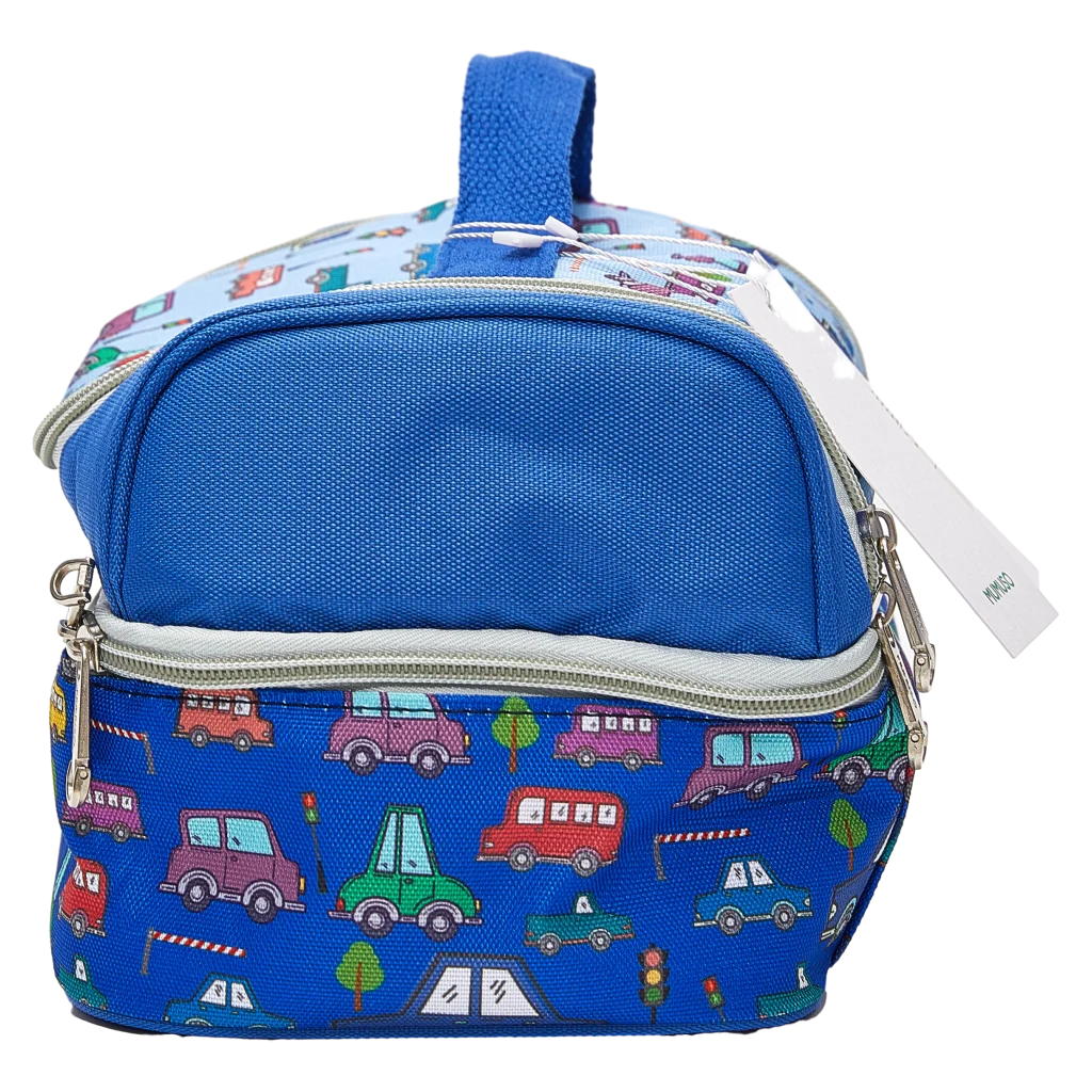 Die blaue Lunch-Bag überzeugt mit fröhlichem Auto-Design und besteht aus strapazierfähigem Polyester. Beide Fächer lassen sich einzeln per Reißverschluss öffnen und erleichtern das Sortieren von Speisen und Snacks. Der bequeme Tragegriff macht das Handling einfach.