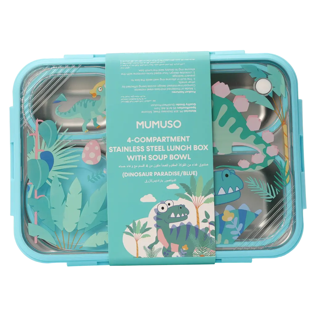 Die Edelstahl-Brotdose mit vier Fächern und zusätzlicher Suppenschale eignet sich ideal für Kinder und Erwachsene. Das fröhliche Dinosaurier-Design (Blau) macht sie besonders attraktiv für die Schule oder das Büro. Dank ihrer robusten Materialien ist eine langlebige Nutzung gewährleistet.