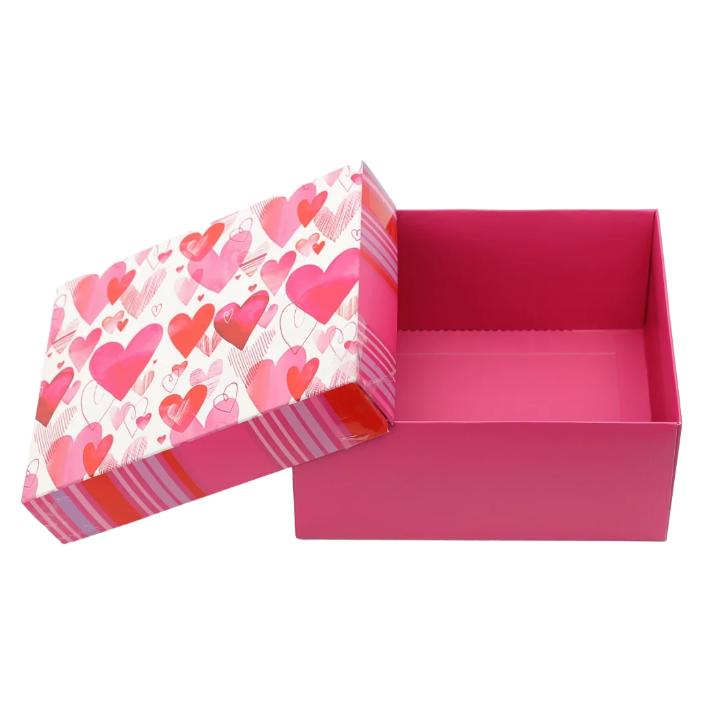 Mit ihrem auffälligen Herz-Design in verschiedenen Rosatönen und Akzentstreifen überzeugt die Box optisch auf ganzer Linie. Die stabile Karton-Ausführung sorgt für einen sicheren Halt und schützt den Inhalt zuverlässig.