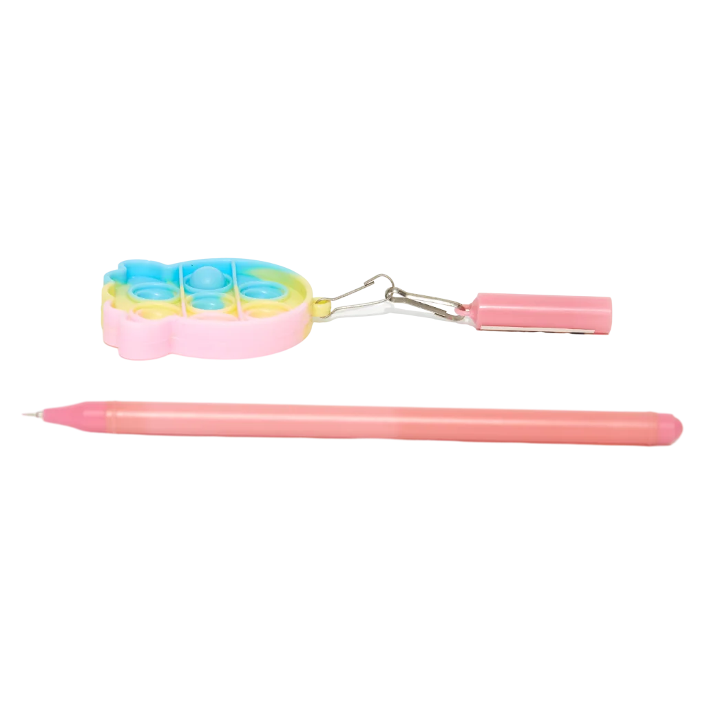 Gelstift mit ergonomischem Griff für entspanntes Schreiben, kombiniert mit einem abnehmbaren Stress-Relief-Anhänger aus Silikon im bunten Design (Rosa/Gelb/Blau). Ideal für den Schul- und Büroalltag, unterstützt Konzentration und fördert Stressabbau.