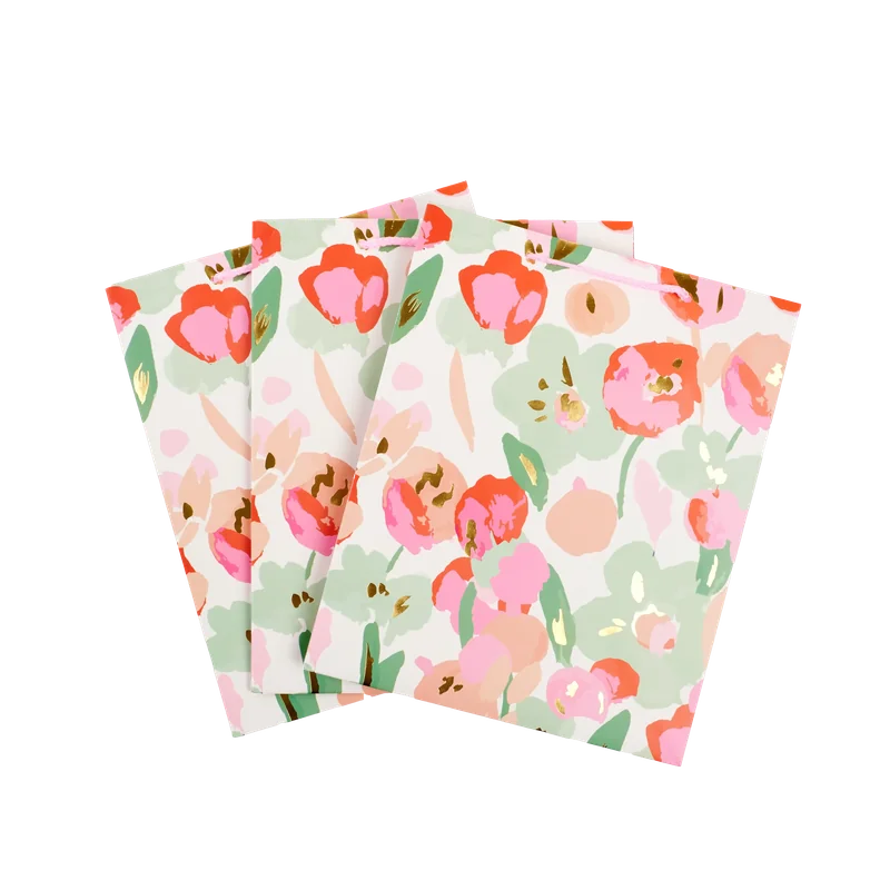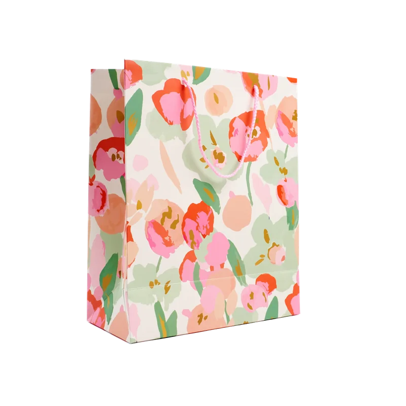 Die Tüte überzeugt durch einen frischen Blumen-Print in Rosa und Grün, ergänzt durch dezente goldene Akzente. Das Papier fühlt sich wertig an und die Kordelgriffe sorgen für einen angenehmen Halt. Das Design ist sowohl zeitlos als auch modern und passt zu vielen Gelegenheiten.