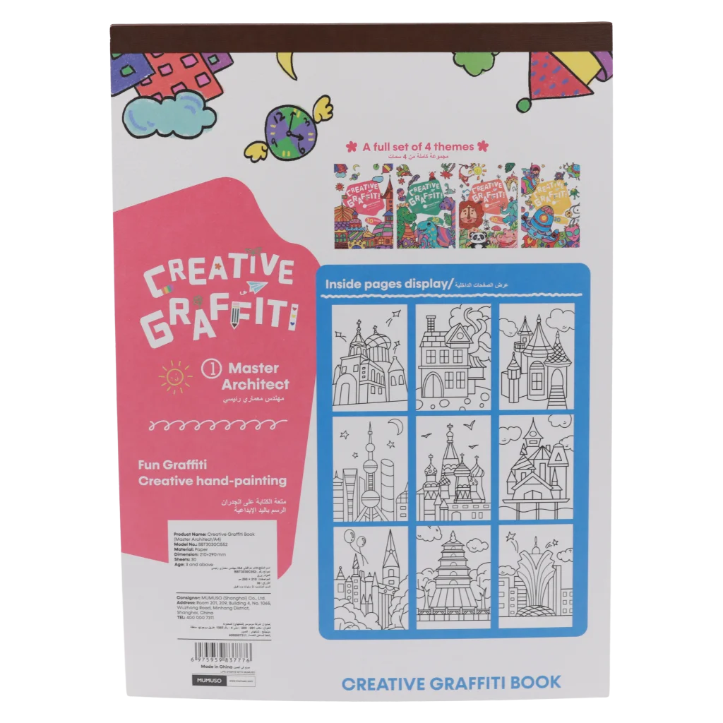 Das Graffiti Malbuch A4 mit 30 Seiten bietet kreative Ausmalbilder rund um fantasievolle Architektur. Ideal für Kinder und Erwachsene, die entspannt malen und ihrer Kreativität freien Lauf lassen möchten. Perfekt für Freizeit und entspannte Lernphasen.