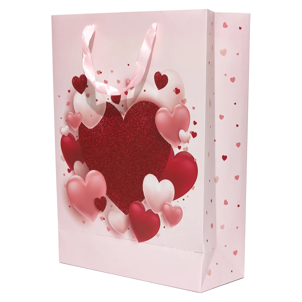 Die Tasche ist in einem sanften Rosa gehalten und zeigt ein auffälliges Herz-Design mit funkelnden Glitzerelementen und verschiedenen Pink- und Rottönen. Dank der praktischen Größe bietet sie ausreichend Platz für größere Geschenke und bleibt dank der stabilen Tragegriffe komfortabel in der Handhabung.