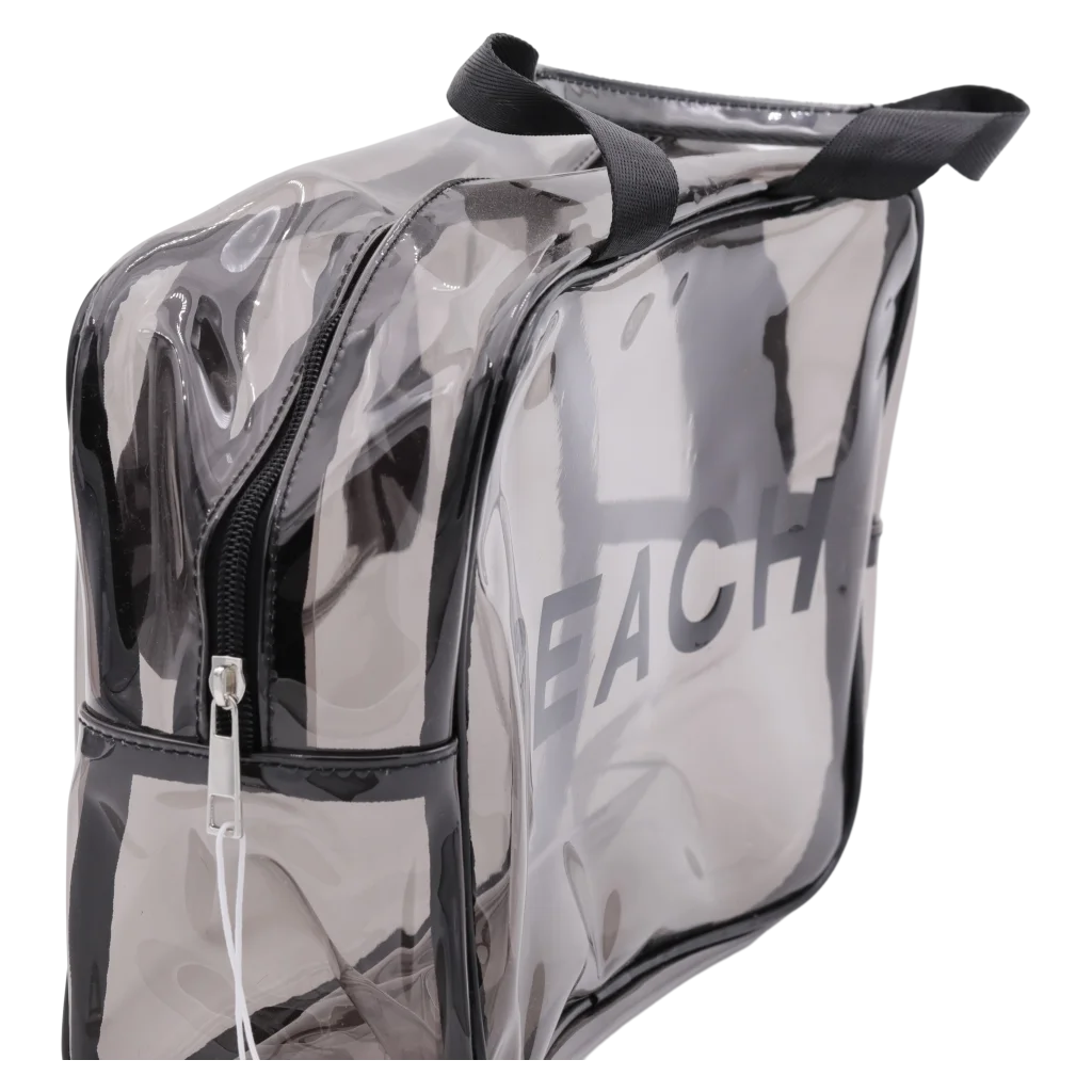 Gefertigt aus strapazierfähigem Stoff-PVC, präsentiert sich die Tasche in modernem, durchsichtigem Design mit auffälligem BEACH-Print (Schwarz). Die zwei robusten Tragegriffe sorgen für einen angenehmen Transport, während der Rundum-Reißverschluss einen leichten Zugriff ermöglicht. Die transparente Optik erlaubt schnellen Überblick über den Inhalt.