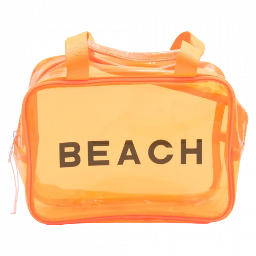 Die Tasche besticht durch ihr auffälliges, transparentes Design in Orange mit dem Print “BEACH” auf der Vorderseite. Das hochwertige PVC sorgt für leichte Reinigung und macht die Tasche strapazierfähig, während der großzügige Stauraum Platz für alle wichtigen Pflegeprodukte bietet.