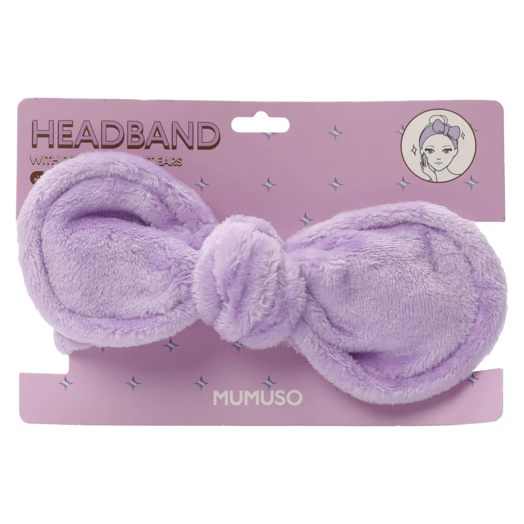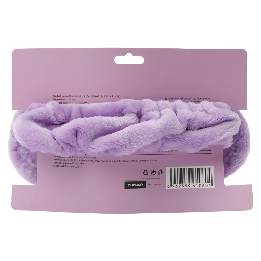Weiches Haarband aus 100% Polyester (Lila) mit biegsamen Hasenohren, ideal zum Zurückhalten der Haare beim Abschminken oder während der Gesichtspflege. Geeignet für Erwachsene und Jugendliche. Angenehm auf der Haut und waschbar.