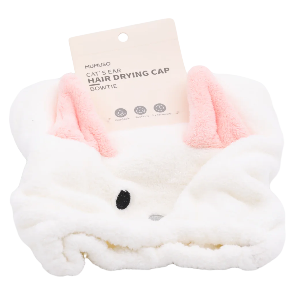 Gefertigt aus 85% Polyester und 15% Nylon, überzeugt die Haartrockenkappe durch ihr flauschig-weiches, saugfähiges Material. Die typischen Katzenohren, der verspielte Schleifen-Print und das zweifarbige Design (Weiß/Rosa) machen die Kappe zum Hingucker.