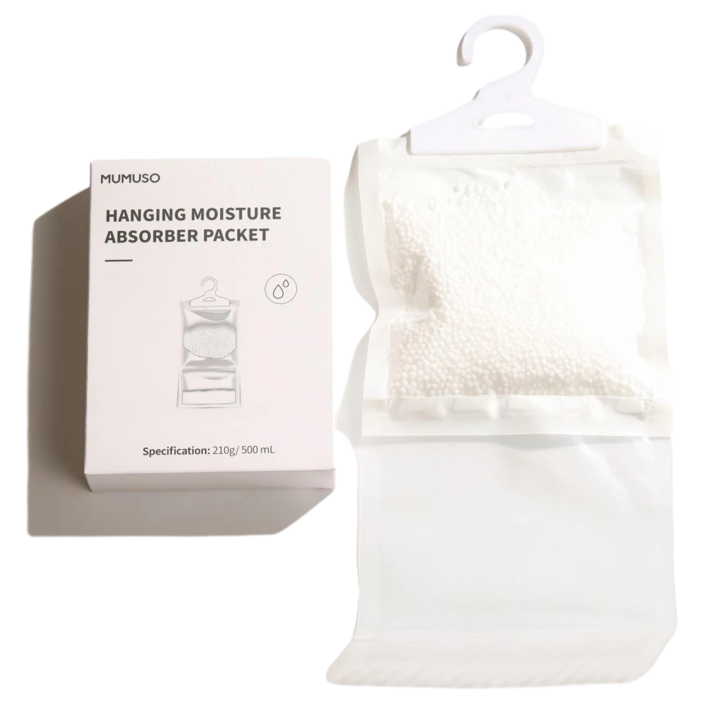 Der Entfeuchter besteht aus Calciumchlorid und wird als transparenter Beutel mit integriertem Aufhänger geliefert. Dank seines schlanken und diskreten Designs passt er unauffällig in verschiedene Wohnumgebungen. Mit einem Füllgewicht von 210 g ist er besonders ergiebig.