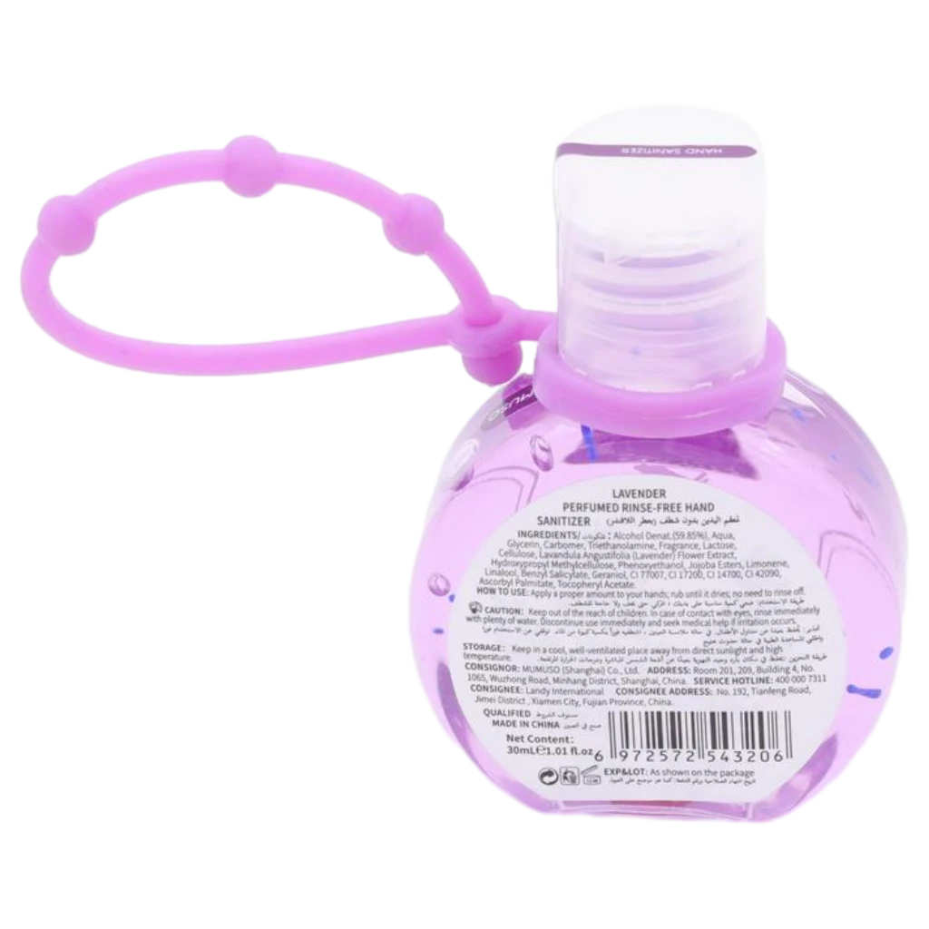 Das handliche Gel wird in einer runden, transparenten 30 ml Flasche (Lila) geliefert und ist mit einer flexiblen Silikonhalterung ausgestattet. Der angenehme Lavendelduft sorgt für ein frisches Gefühl nach jeder Anwendung, während das praktische Design eine einfache Befestigung an Tasche oder Rucksack ermöglicht.