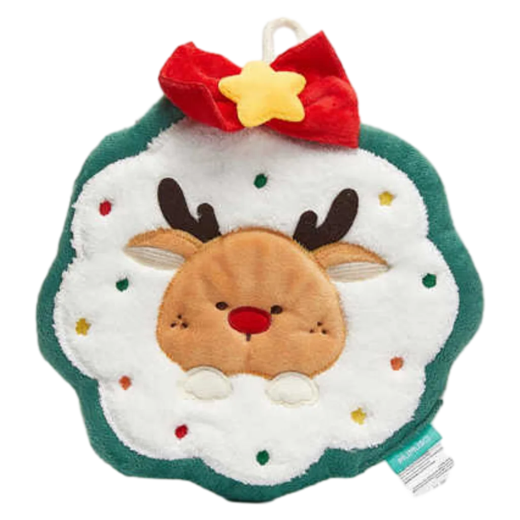 Das Handtuch überzeugt durch sein kuscheliges Material und ein attraktives Rentier-Design mit bunten Akzenten auf der Vorderseite. Ein angenähter Aufhänger mit dekorativer Schleife und Stern verleiht weihnachtlichen Charme. Die Farbgestaltung ist überwiegend Weiß mit grünen und roten Details, zudem sorgt das Design für einen freundlichen Blickfang.