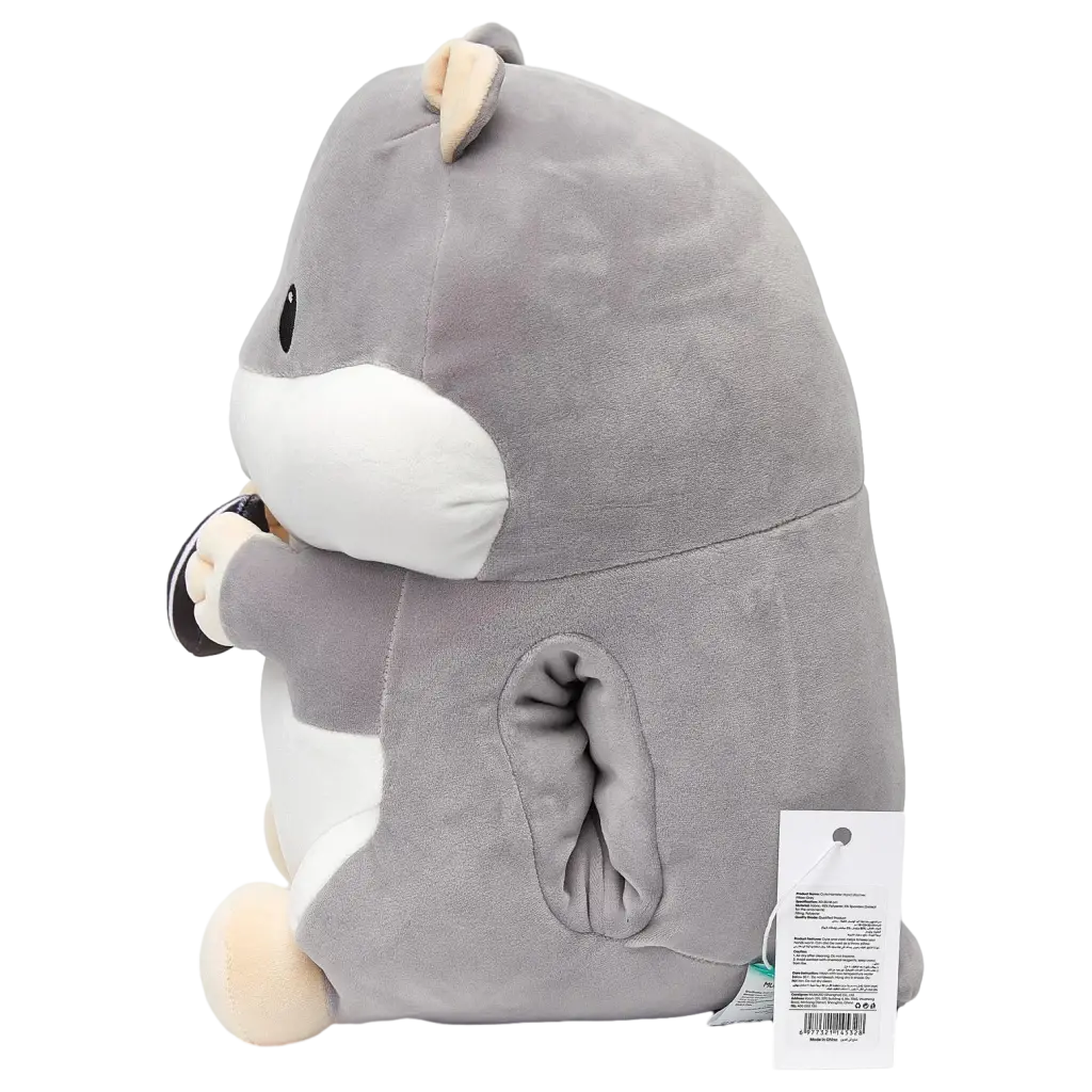 Das Kissen präsentiert sich im freundlichen Hamster-Design (Grau) und begeistert durch einen besonders soften und anschmiegsamen Außenstoff aus 95% Polyester und 5% Elasthan, während die Füllung aus hochwertiger Polyesterfaser besteht. Die großen Öffnungen an den Seiten laden dazu ein, beide Hände bequem hineinzustecken.