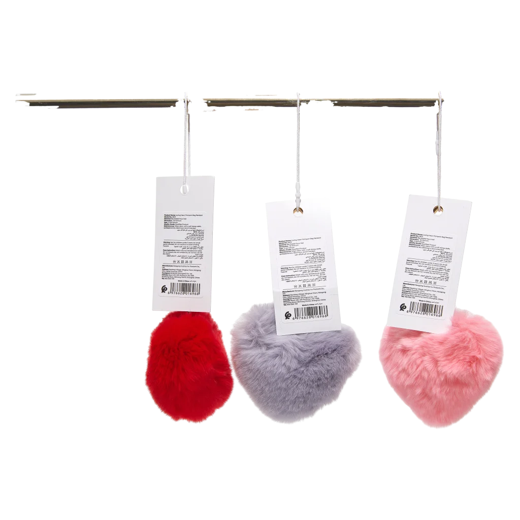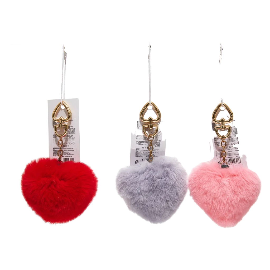Gefertigt aus weichem Oryctolagus-Pelz (Zuchtkaninchenfell), überzeugt der Pompom durch seine angenehme Haptik und hohe Flauschigkeit. Das Herz-Design und die Farben (Rot/Lila/Rosa) bringen frischen Wind in den Alltag.