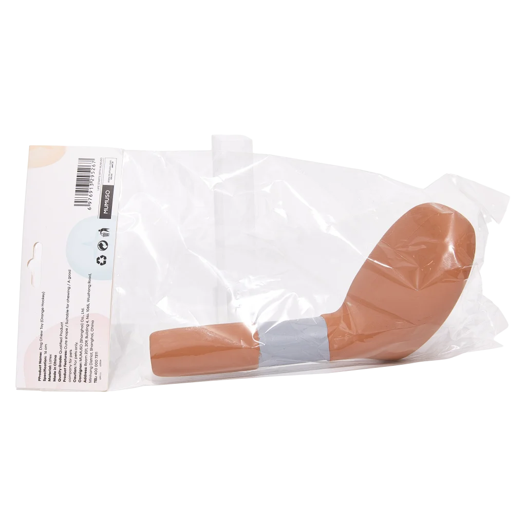 Das Hundespielzeug besticht durch sein auffälliges orangefarbenes Hockeyschläger-Design und fühlt sich angenehm an. Gefertigt aus flexiblem Latex, hält es auch kräftigem Kauen stand und ist leicht zu reinigen.
