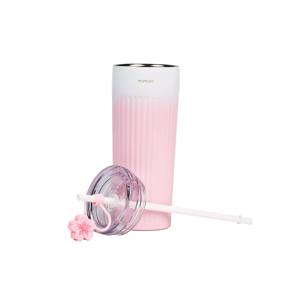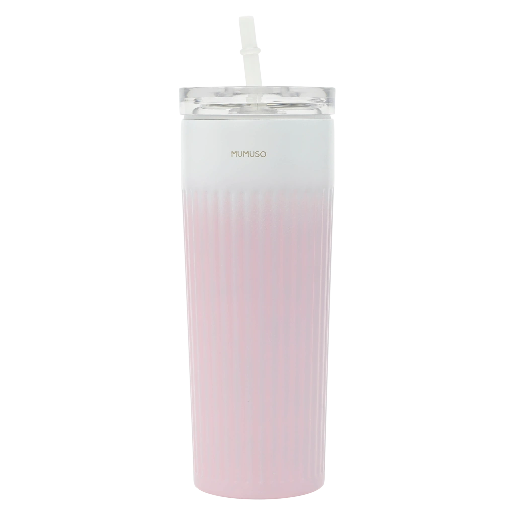 Das zarte Rippen-Design in Rosa und die Kombination aus Edelstahl 304 (innen) und Edelstahl 201 (außen) bieten langlebige Qualität und eine moderne Optik. Der Deckel besteht aus robustem PP, die Strohhalmhülse aus flexiblem Silikon – alles abgestimmt auf sichere und komfortable Nutzung im Alltag.