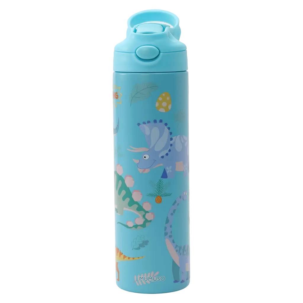 Die isolierte Kinder-Trinkflasche aus Edelstahl mit Dinosaurier-Design (Blau) ist ideal für Schule, Kindergarten oder Ausflüge. Dank doppelwandiger Konstruktion hält sie Getränke zuverlässig warm oder kalt und bietet mit dem Klappdeckel besondere Sicherheit. Keywords: Trinkflasche, Edelstahl.