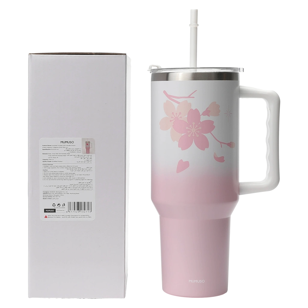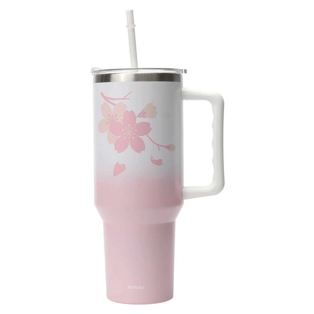 Isolierter Trinkbecher mit Henkel und Strohhalm, 1200 ml, Kollektion Kirschblüte (Pink) mit Kirschblüten-Design