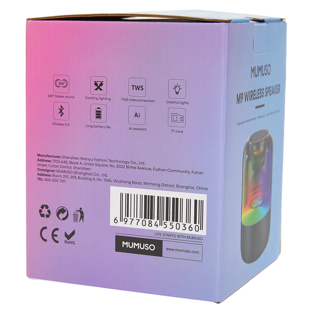 Der kabellose Lautsprecher M9 ist ideal für Musikliebhaber, die flexiblen Bluetooth-Sound zu Hause oder unterwegs genießen möchten. Das modern gestaltete Gerät überzeugt durch Farb-LED-Effekte und hohe Kompatibilität. Einfache Verbindung und ausgezeichnete Klangqualität sorgen für vielseitigen Einsatz.