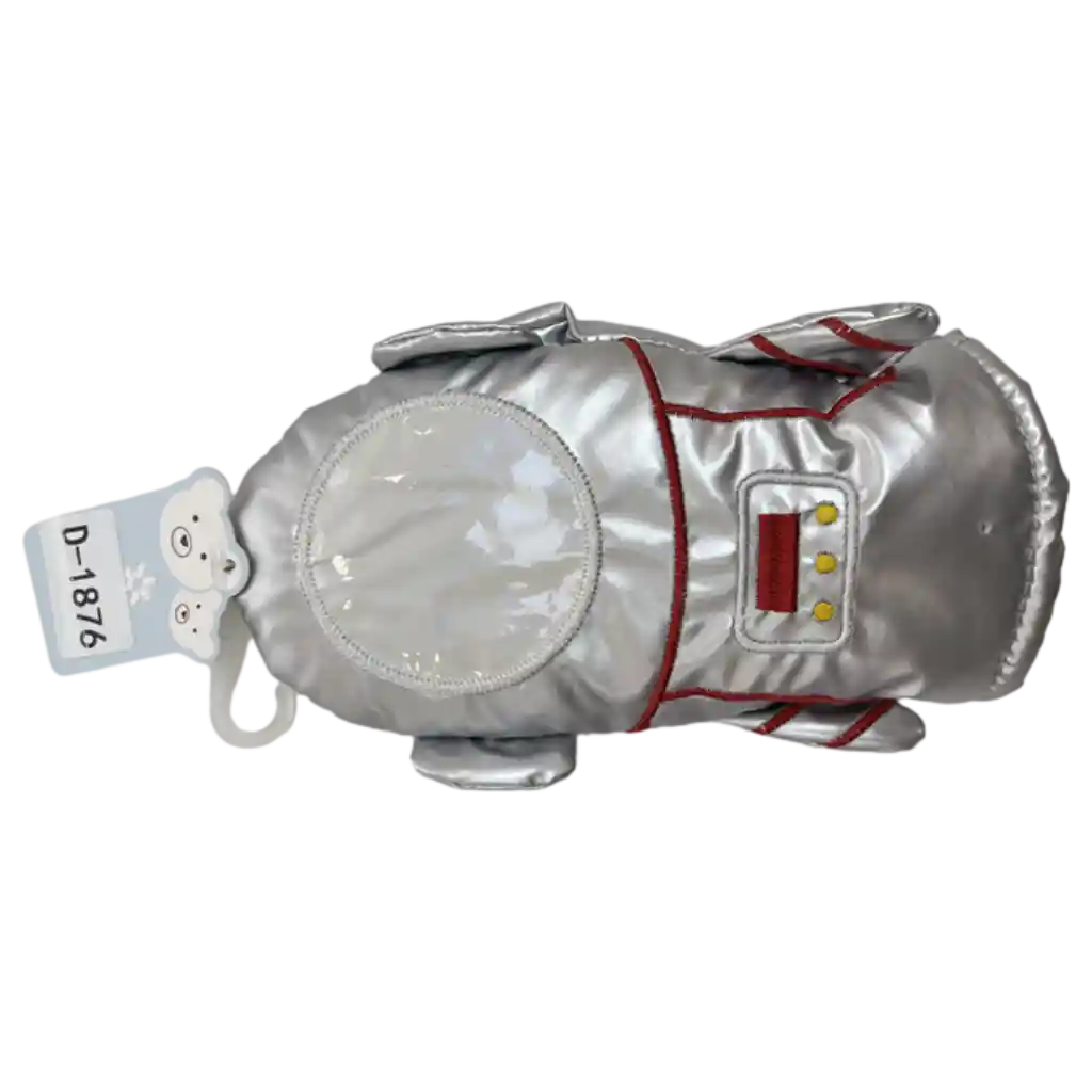 Der wattierte Handschuh überzeugt durch einen auffälligen silbernen Look mit roten Akzenten und aufgestickten Details, die an einen Raumanzug erinnern. Seine Oberfläche fühlt sich angenehm weich an und bietet einen guten Kälteschutz für Kinderhände.