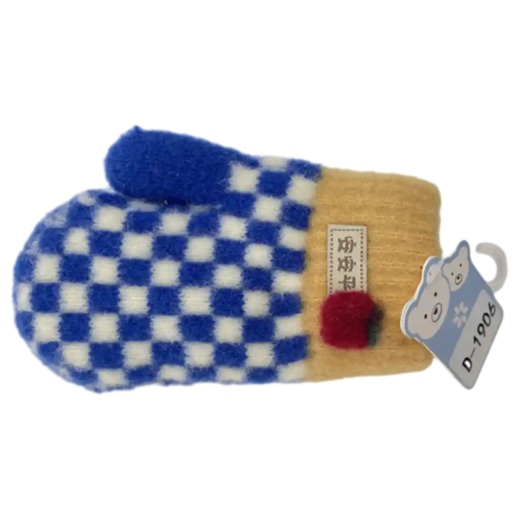 Der Handschuh besticht durch sein auffälliges Karomuster-Design in Blau und Creme sowie einen kontrastierenden gelben Bund. Eine kleine rote Applikation setzt einen verspielten Akzent. Das gestrickte Material fühlt sich weich an und bietet einen angenehmen Tragekomfort.