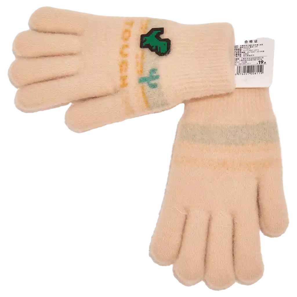 Gefertigt aus weichem Strickmaterial, überzeugen diese Handschuhe durch ihre angenehme Haptik und das verspielte Dinosaurier-Design in zartem Beige mit farbigen Akzenten. Das dezente Muster passt zu verschiedenen Outfits und ist besonders bei Kindern beliebt.