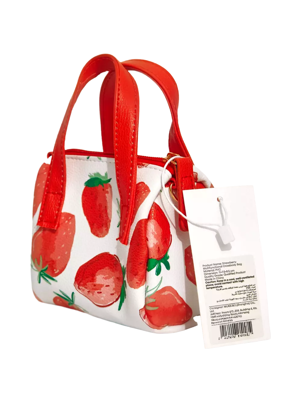 Gefertigt aus hochwertigem Kunstleder, besticht die Tasche durch ihren fröhlichen Erdbeer-Print auf weißem Hintergrund. Die roten Henkel setzen einen schönen Akzent und sorgen für einen angenehmen Tragekomfort.