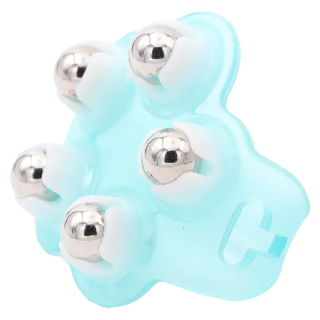 Der handförmige Massagehandschuh besteht aus stabilem Kunststoff in Hellblau und verfügt über fünf leichtläufige Metallrollen. Das ergonomische Design liegt angenehm in der Hand und macht die Massageanwendung besonders komfortabel.