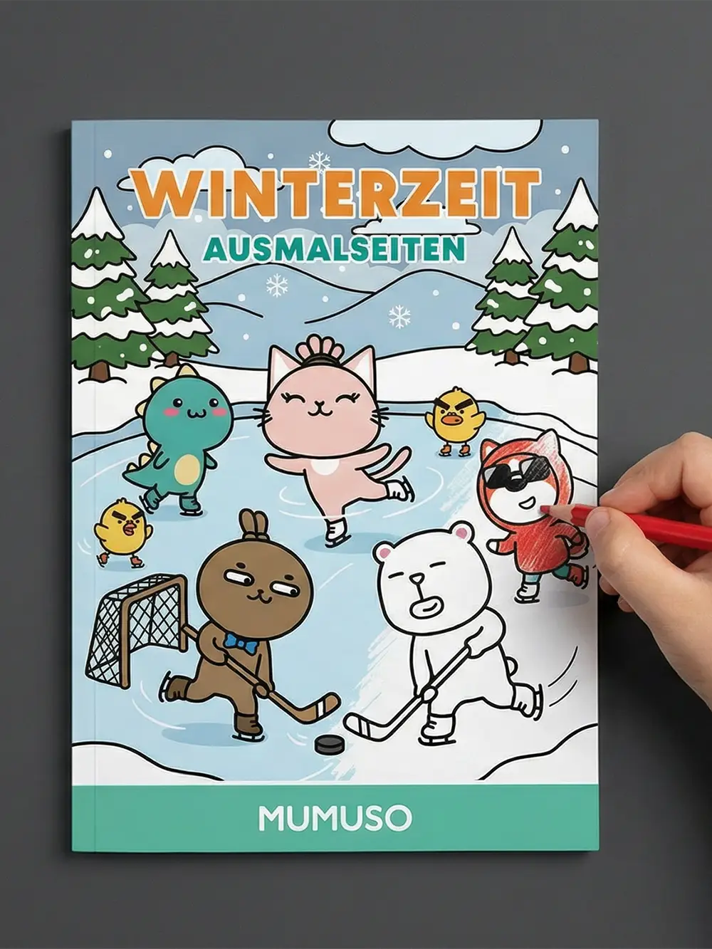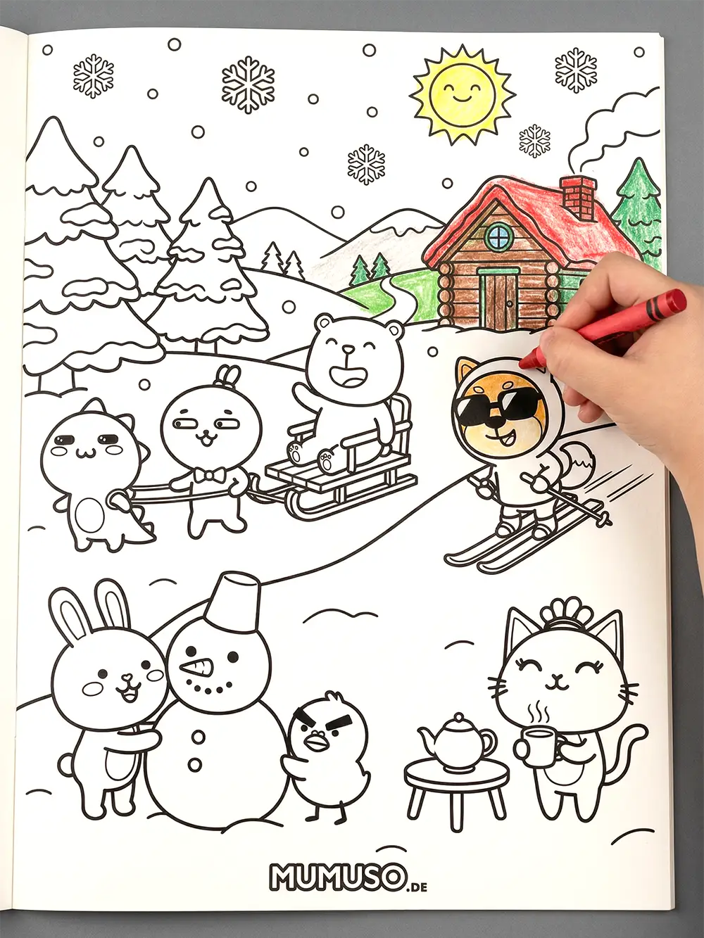 Das PDF enthält 10 winterliche Ausmalmotive mit unseren beliebten Mumuso-Charakteren – z. B. beim Schlittenfahren, Schneemannbauen, Tee trinken oder im Winterwald.