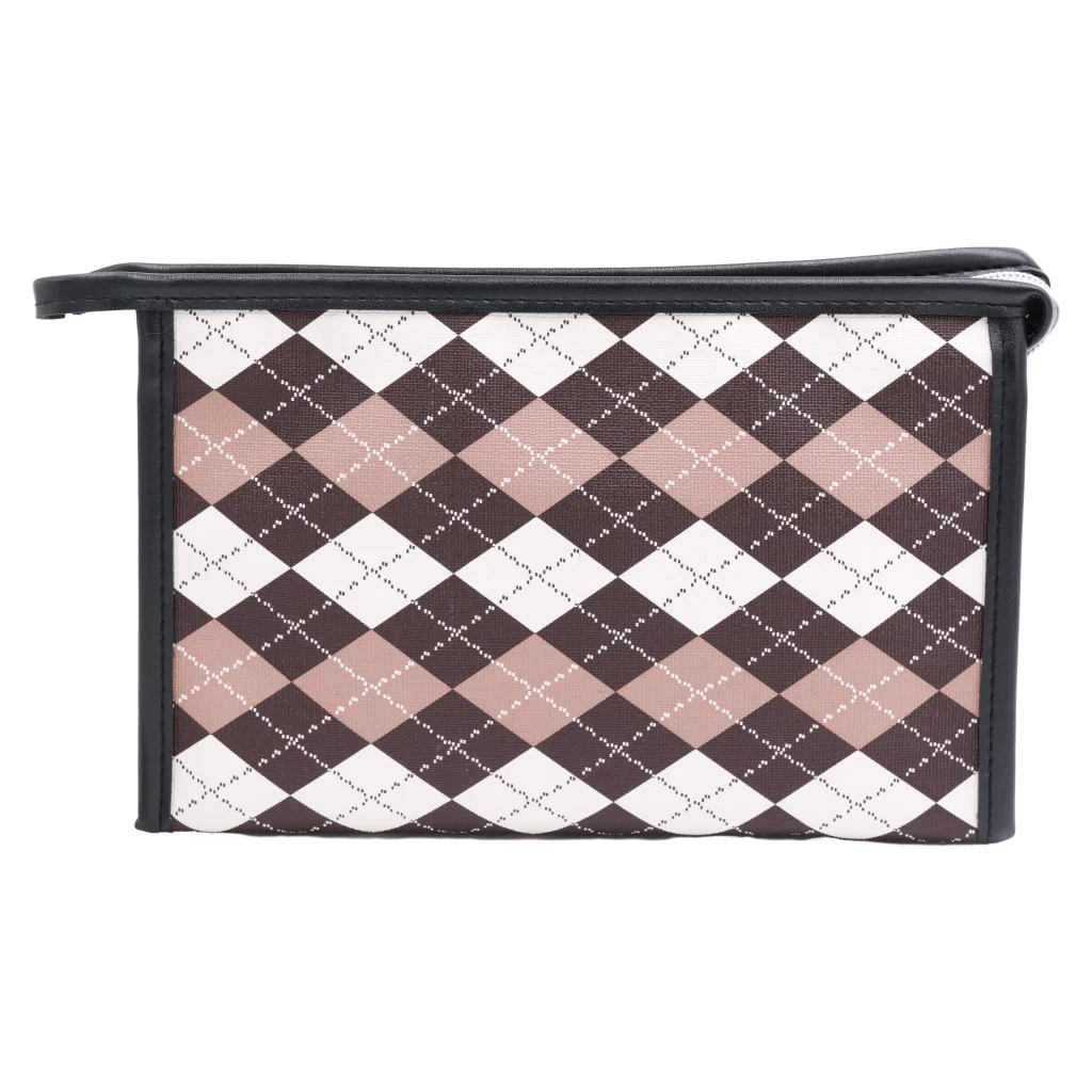 Kunstleder Make-up-Tasche trapezförmig mit Karodesign (Braun/Beige/Weiß)