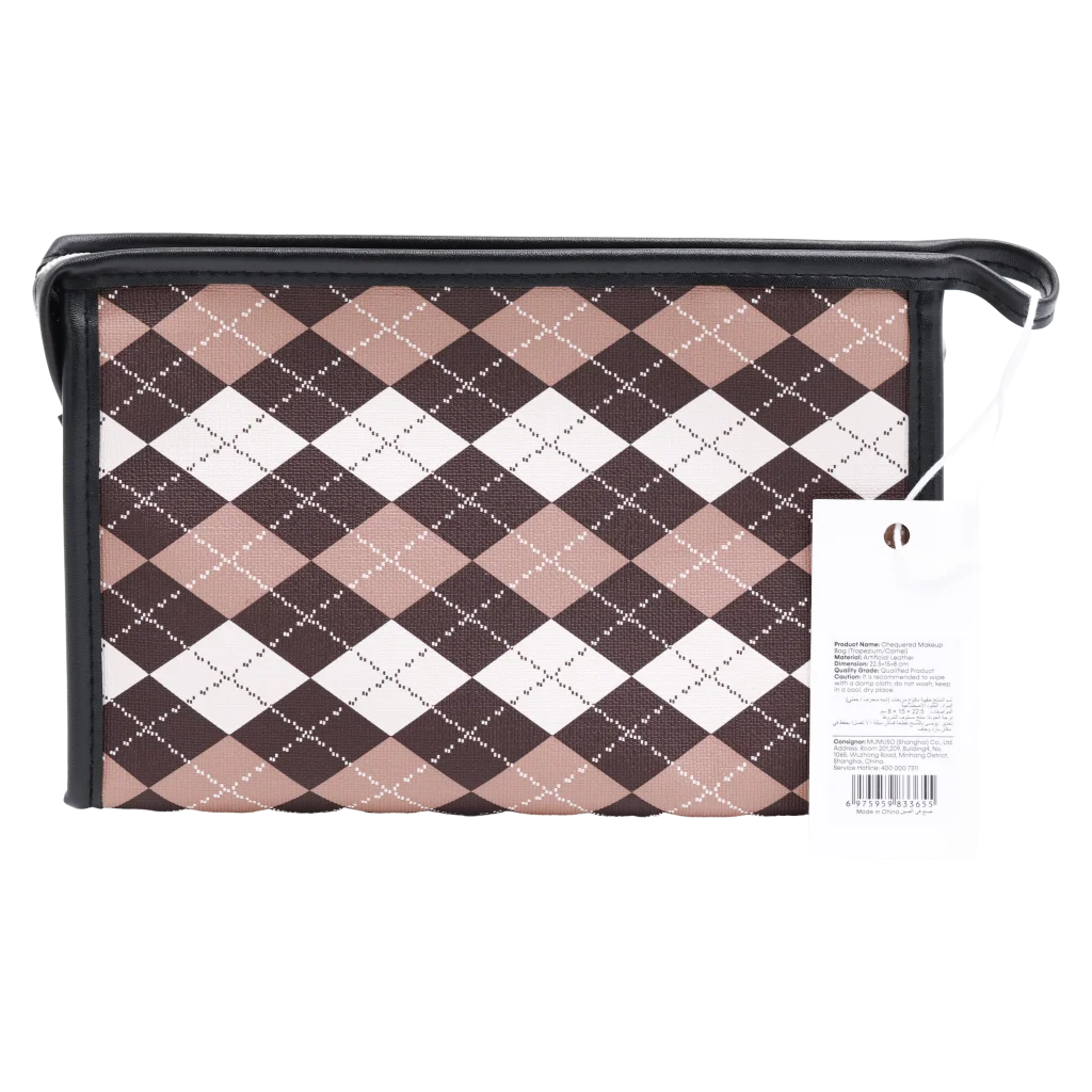 - Kunstleder Make-up-Tasche trapezförmig mit Karodesign (Braun/Beige/Weiß)