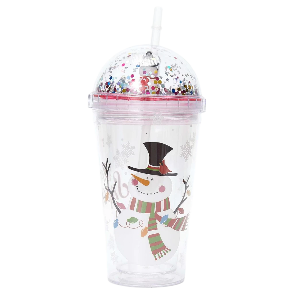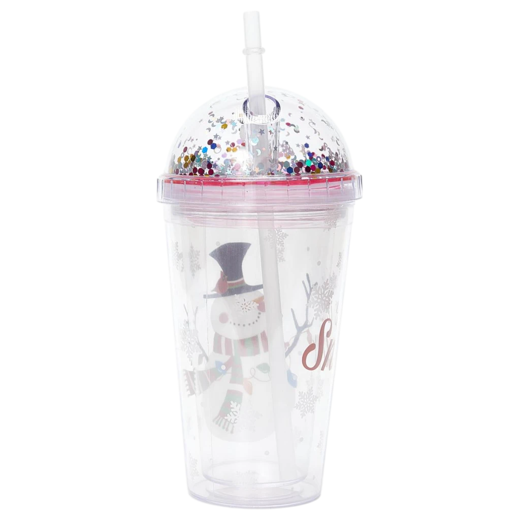 - Kunststoff-Trinkbecher mit Kuppeldeckel und Strohhalm, Schneemann-Design, 450 ml (Transparent)