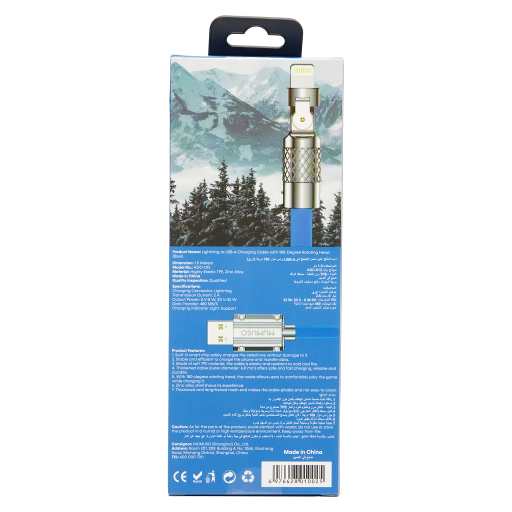 Dieses Lightning-zu-USB-A-Ladekabel ist ein praktischer Begleiter für Nutzer von iPhone, iPad oder anderen Apple-Geräten mit Lightning-Anschluss. Die innovative 180-Grad-Drehfunktion des Steckers ermöglicht flexibles Laden auch in engen oder schwer erreichbaren Bereichen.