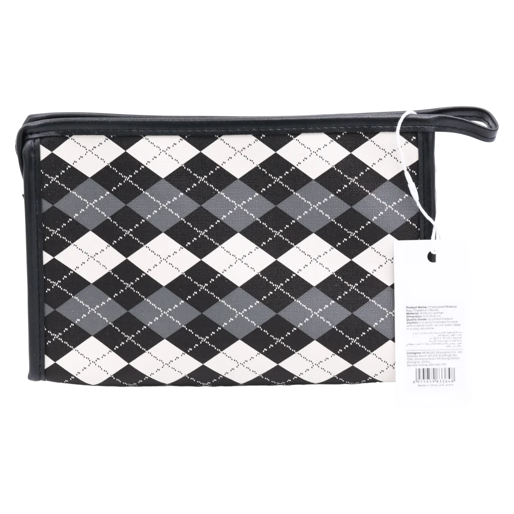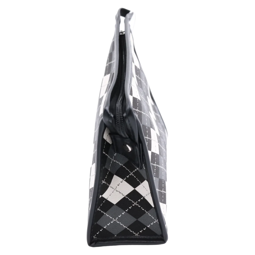 Die Make-up-Tasche aus Kunstleder mit Rautenmuster-Design (Schwarz/Weiß/Grau) bietet stilvolle Aufbewahrung für Kosmetikartikel. Sie ist ideal für unterwegs oder zu Hause und schützt Utensilien zuverlässig vor Schmutz sowie Feuchtigkeit. Perfekt für alle, die eine praktische und pflegeleichte Aufbewahrungslösung suchen.