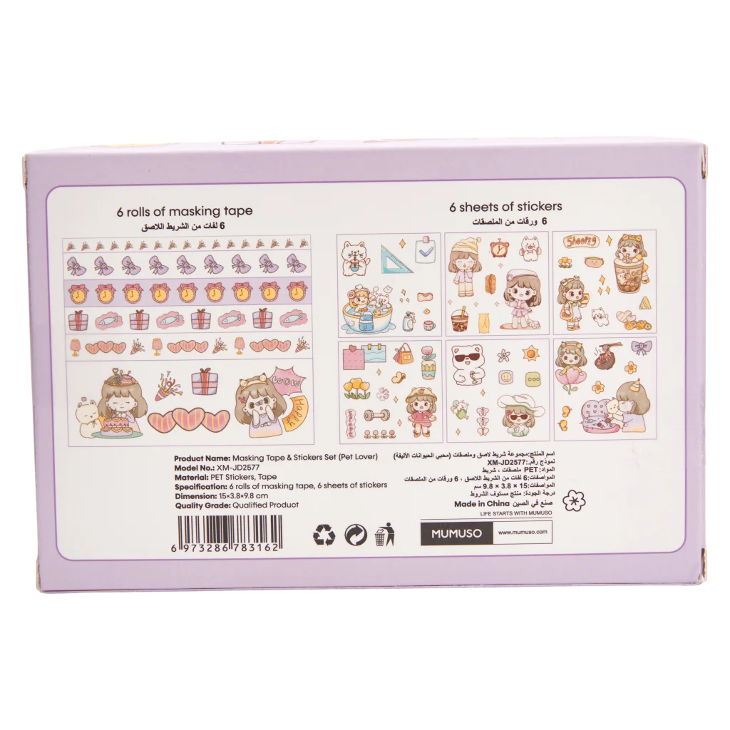Das Masking Tape & Sticker Set mit Tierliebhaber-Design eignet sich ideal zum Verzieren von Briefen, Notizbüchern oder Geschenken. Das Set enthält sechs Rollen Washi Tape und sechs Stickerbögen mit liebevollen Motiven, perfekt für kreative Bastelprojekte oder zum Dekorieren von Kalendern.