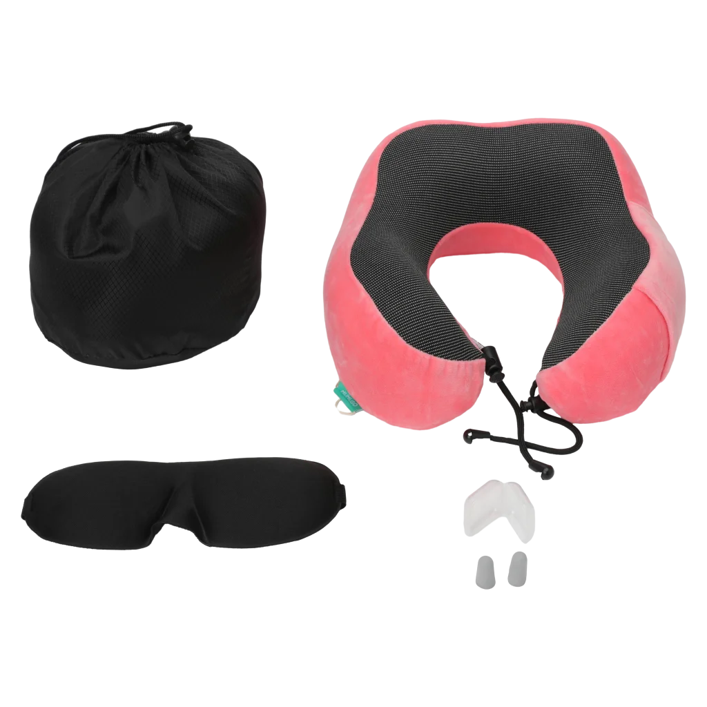 Nackenkissen-Set aus Memory Foam mit Augenmaske und Ohrstöpseln, ergonomisch, waschbar (Pink/Schwarz)