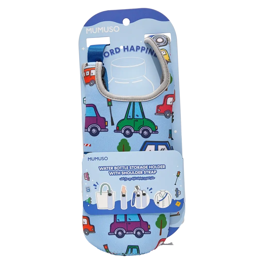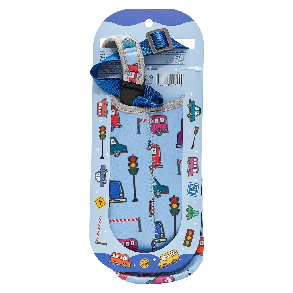 Gefertigt aus strapazierfähigem Neopren, bietet der Flaschenhalter eine zuverlässige Polsterung und Schutz. Das verspielte Auto-Design auf hellblauem Hintergrund macht den Halter besonders ansprechend für Kinder und sorgt für gute Laune beim Tragen.
