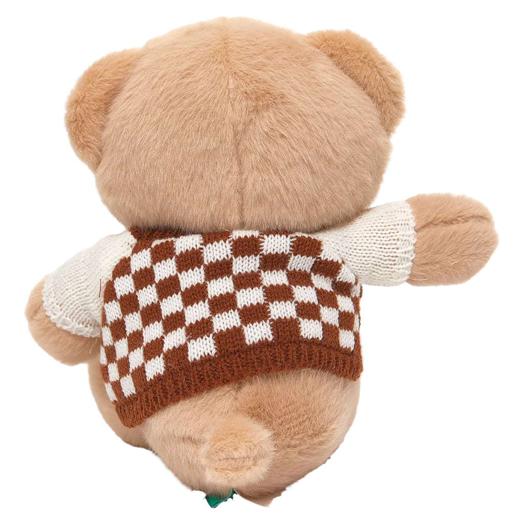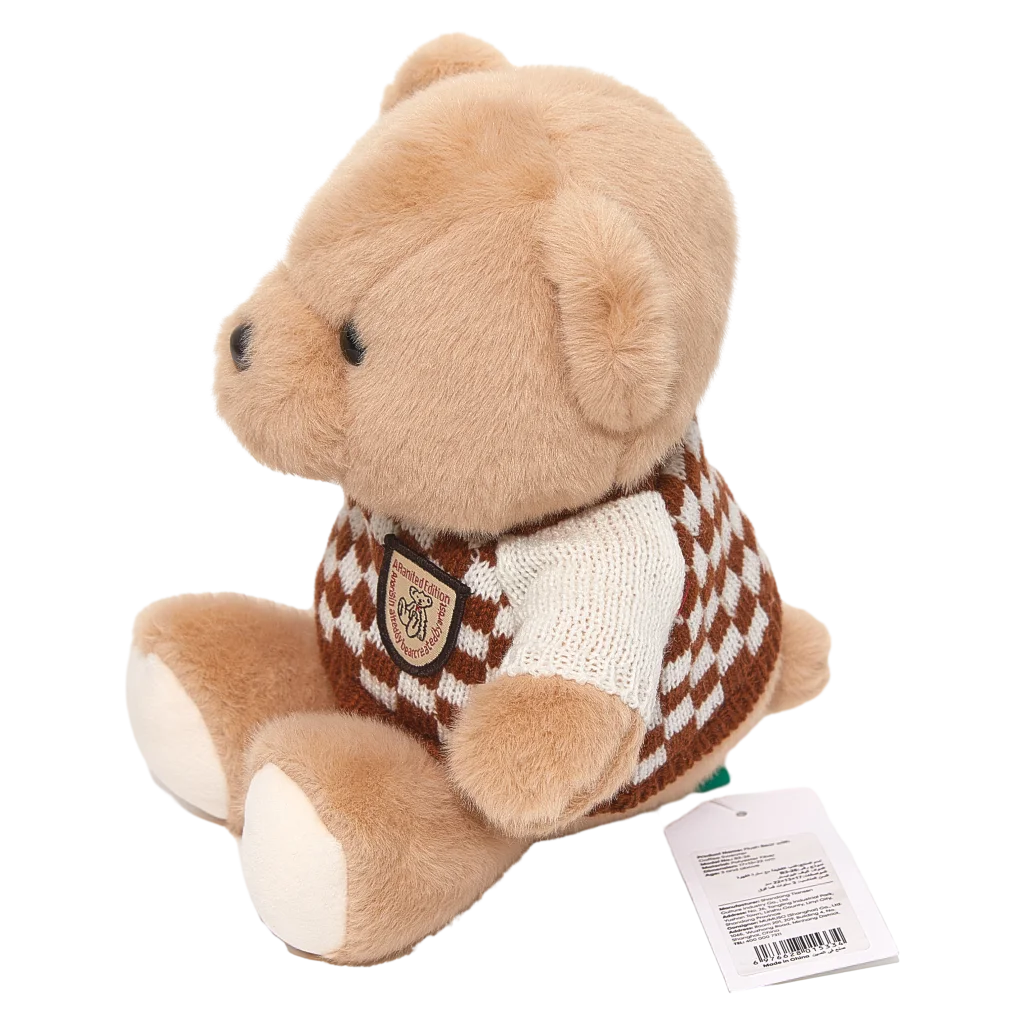 Der Plüschbär besticht durch sein weiches, beiges Fell und den gestrickten Pullover im braun-weißen Karomuster. Die hochwertige Verarbeitung und liebevollen Details, wie das aufgenähte Emblem, machen den Bären besonders ansprechend.
